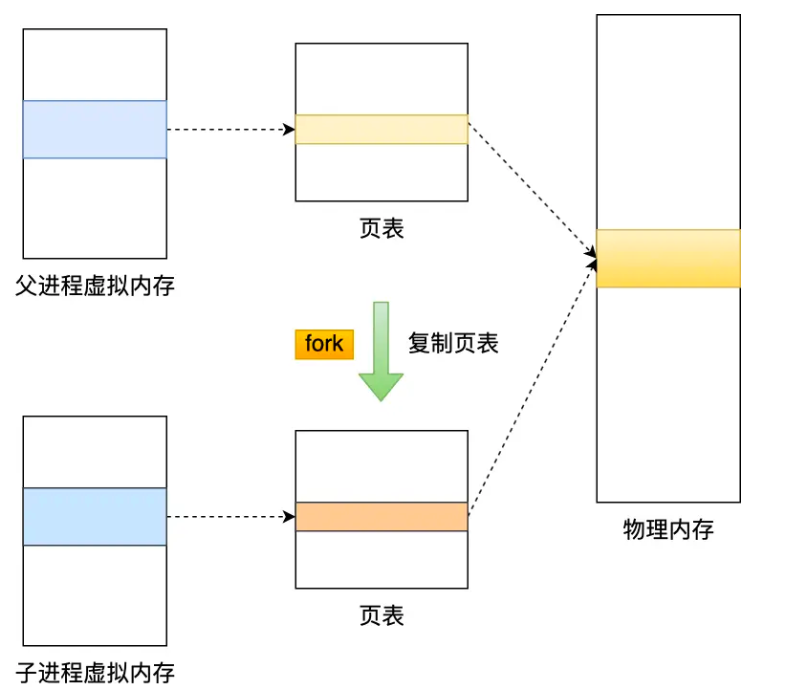 在创建子进程的过程中,操作系统会把父进程的「页表」复制一份给子进程,这个页表记录着虚拟地址和物理地址映射关系,而不会复制物理内存,也就是说,两者的虚拟空间不同,但其对应的物理空间是同一个。