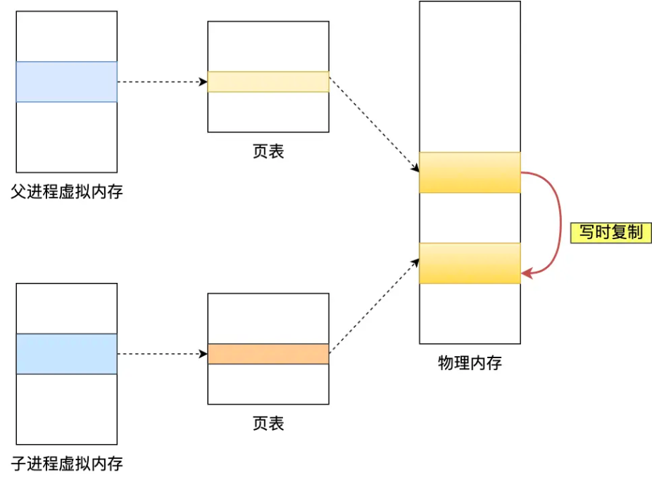 当父进程或者子进程在向共享内存发起写操作时,CPU 就会触发写保护中断,这个「写保护中断」是由于违反权限导致的,然后操作系统会在「写保护中断处理函数」里进行物理内存的复制,并重新设置其内存映射关系,将父子进程的内存读写权限设置为可读写,最后才会对内存进行写操作,这个过程被称为「写时复制(Copy On Write)」。